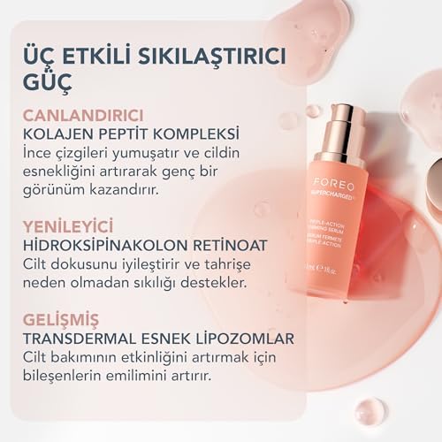 ÜÇ ETKİLİ SIKILAŞTIRICI GÜÇ Bu gelişmiş yüz serumu, cilt elastikiyetini artıran, derinlemesine nemlendiren ve daha pürüzsüz, daha genç bir görünüm sağlayan doğal bileşenlerin güçlü bir karışımıdır. ÜSTÜN NEM TAKVİYESİ Hyaluronik Asit ve Skualan ile zenginleştirilmiş bu su bazlı nemlendirici, pürüzsüz ve dolgun bir görünüm için cilt bariyerini destekleyerek derinlemesine nemlendirme sağlar. RETİNOLE NAZİK BİR ALTERNATİF HPR, retinole benzer cilt yenileme etkileri sunmakla birlikte daha hafif olup hassas ciltler için idealdir ve tahrişe neden olmadan yaşlılık lekelerini azaltır %90 DOĞAL KAYNAKLI BİLEŞENLER Bu lüks formül, vegan ve hayvanlarda denenmiyor olmasının yanı sıra nazik ve etkili bir yüz bakımı için Hyaluronik Asit ve Skualan gibi doğanın en iyilerini kullanır. MİKRO AKIMLI CİHAZLAR İÇİN OPTİMİZE EDİLMİŞTİR Bu mikro akım jeli, mikro akımlı yüz sıkılaştırma cihazlarının performansını optimize ederek sonuçları destekler, her kullanımda cilt sıkılığını artırır. FOREO Supercharged sıkılaştırıcı serum, üç kat etkili – iletken jel – hiyalüronik asit ve skualan – yüz nemlendirici serum – vegan ve hayvanlar üzerinde denenmemiştir – tüm cilt tipleri – 30 ml