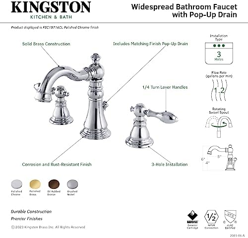Katı pirinç yapı Damlatmayan seramik disk kartuşu Güverte montajı 8 “ila 16” yaygın 3 delikli kurulum 60 PSI'da 1.2 GPM/4.5 LPM emzik akış hızı Standart 1/2 inç IPS bağlantısı 3-15/16 inç ağız boşluğu 5-3/16 “ağızlı erişim Uyumlu kaplama açılır tahliye içerir Çift kollu tutamaklar ADA yönergelerine uygundur FSC1972ACL Amerikan Klasik Yaygın Banyo Bataryası, 5-1/8 İnç Emzik Erişimi, Parlak Pirinç