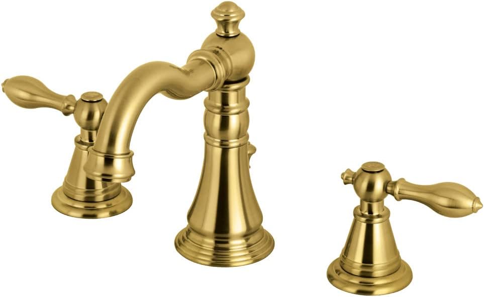 Sağlam pirinç yapı Damlatmayan seramik disk kartuşu Döşeme montajı 20,32 cm ila 40,64 cm geniş 3 delikli kurulum 60 PSI'da 1,2 GPM/4,5 LPM musluk akış hızı Standart 1/2 inç IPS bağlantısı. 3 15/16 inç ağızlık açıklığı. 5 3/16 inç ağızlık erişimi. Eşleşen açılır tahliye içerir. Çift kollu saplar ADA kılavuzlarına uygundur. Korozyona dayanıklı kaplama FSC1973AL İngiliz Klasik Yaygın Banyo Bataryası Perakende Pop-Up, Fırçalanmış Pirinç, 12,7 cm