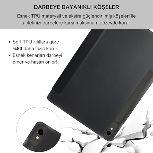 Uyumluluk: Yalnızca Galaxy Tab S9 FE 10.9 inç uyumlu olacak şekilde dizayn edilmiştir. Lütfen satın almadan önce arka tarafında yazan kodun üst kısımda belirtilen kodlardan herhangi biriyle eşleştiğinden emin olunuz. Kalite ve Koruma: Premium PU deri dış yüzey, yumuşak mikrofiber astar ve esnek PC malzemeden üretilmiştir. Kılıf, parmak izlerine, darbelere, çizilmelere ve toza karşı tam koruma sağlar. S Pen Kalemlik: S Pen'inizi güvenle saklayabileceğiniz iç kalem yuvası bulunur. Ayrıca kılıfın arka kısmında stylus için manyetik kablosuz şarj desteği de mevcuttur. Kaleminizi istediğiniz zaman kolayca taşıyıp kullanabilirsiniz. Ayarlanabilir Pozisyon: Tab S9 FE Kılıf, izleme ve yazma ihtiyaçlarınızı karşılamak için iki farklı açıda kullanılabilir. Mıktanısları sayesinde açısı bozulmaz ve ergonomik bir kullanım sağlar. Otomatik Uyku Modu: Yerleşik manyetik şerit, kapağı açıp kapattığınızda tabletinizi otomatik olarak uyandırır veya uyku moduna alır. Bu şekilde cihazınızı korur ve pil ömrünü uzatır. Galaxy Tab S9 FE 10.9 inç Uyumlu Smart Kılıf, S Pen Kalemlikli, Trifold, Esnek, Mat, Darbeye Tam Dayanıklı Tablet Kılıfı (Siyah)