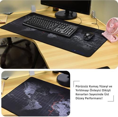 GENİŞ 90X40 CM YÜZEY – Klavye ve mouse birlikte rahat kullanım PÜRÜZSÜZ MİKRO DOKU – Hızlı ve hassas mouse kontrolü KAYMAZ KAUÇUK TABAN – Masada sabit duran güvenli yapı DAYANIKLI DİKİŞLİ KENAR – Uzun ömürlü ve deformasyona dirençli ÖLÇÜ VE İÇERİK – 90×40 cm, 3 mm kalınlık, 1 adet mouse pad Gaming Mouse Pad 90×40 cm Geniş Dünya Haritası Desenli Kaymaz Tabanlı Dikişli Kenar Büyük Klavye Mouse Altlığı Siyah