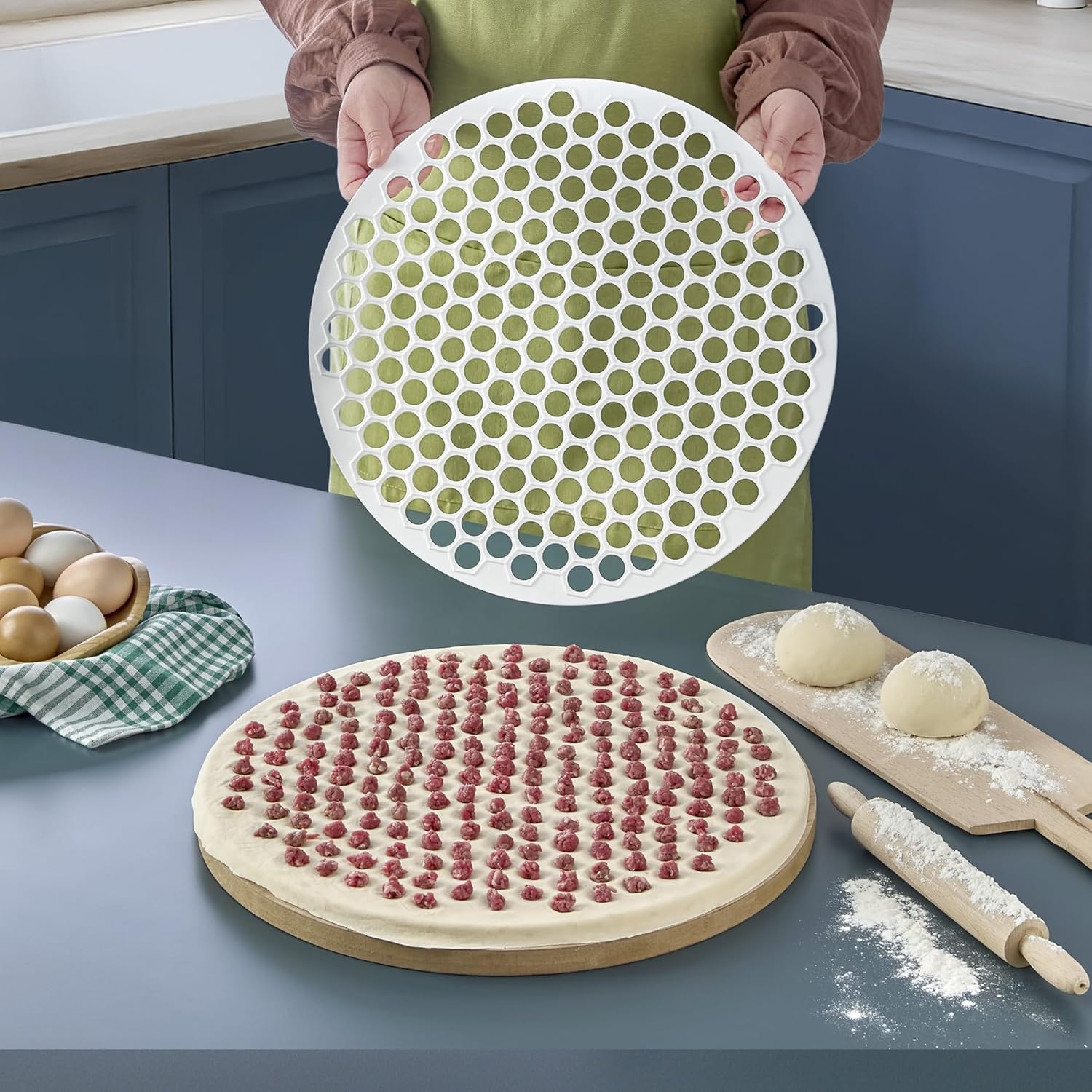 BOYUT: 40 cm çapında geniş yüzeye sahip, 199 göz bölmeli profesyonel mantı kalıbı KULLANIM: Tek seferde 199 adet mantı yapabilme kapasitesi ile zamandan tasarruf sağlar MALZEME: Dayanıklı beyaz plastikten üretilmiş, gıda ile temasa uygun yapı PRATİK TASARIM: Düzenli aralıklı göz yapısı sayesinde eşit boyutlu mantılar hazırlama imkanı TEMİZLİK: Pürüzsüz yüzeyi sayesinde kolay temizlenebilir ve bulaşık makinesinde yıkanabilir özellik GMantı Kalıbı, 40 cm, 199 Gözlü, Beyaz Plastik, El Yapımı Mantı Hazırlama İçin