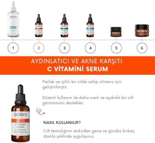 5 C Vitamini ve %0,5 Ferulic Asit içerir. Akne eğilimli ciltler için uygun, hassas ciltlere de uygundur. Derinlemesine nemlendirir ve cilt bariyerini güçlendirir. Sabah ve akşam kullanıma uygundur. GOSIV, Cilt Tonu Eşitleyici C Vitamini Serum