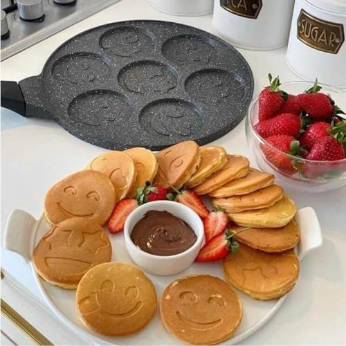 Kahvaltılarınızı Eğlenceye Dönüştürün! Lezzetli ve eğlenceli pankekler yapmak artık çok kolay! Granit Kaplama Gülenyüz Pankek & Tavası, 7 farklı gülen yüz deseniyle kahvaltılarınızı ve atıştırmalıklarınızı daha keyifli hale getiriyor. Ürün Özellikleri: ✅ 7’li Gülenyüz Deseni – Çocuklar ve misafirleriniz için eğlenceli pankekler yapın ✅ Granit Kaplama – Yanmaz & yapışmaz yüzeyi ile kolay pişirme ve temizlik ✅ Döküm Malzeme – Eşit ısı dağılımı sağlar, her seferinde mükemmel sonuçlar elde edin ✅ 27 cm Çapında Geniş Yüzey – Aynı anda 7 adet mini pankek veya krep yapabilirsiniz ✅ Ahşap Desenli Ergonomik Sap – Güvenli ve rahat kullanım sağlar ✅ Gaz, Elektrik ve Seramik Ocaklara Uygun – Her mutfakta kullanıma uygun tasarım Kullanım Alanları: Pankek & – Mükemmel kıvamda pankekler hazırlayın Yumurta & Omlet – Küçük porsiyonlarda ideal pişirme sağlar Mini Tatlılar & Aperatifler – Çikolatalı pankekler, meyveli tatlılar ve daha fazlası Teknik Bilgiler: Çap: 27 cm Malzeme: Döküm gövde, granit kaplama Kullanım Alanı: Gazlı ocak, elektrikli ocak, seramik ocak Temizlik ve Bakım: Kolay Temizlik – Yapışmaz yüzeyi sayesinde az yağ ile kullanılır, kolay temizlenir. Bulaşık makinesinde yıkamayınız. ✨ Sünger veya yumuşak bez ile temizleyerek ömrünü uzatabilirsiniz. Kahvaltılarınızı Eğlenceye Dönüştürün! Granit Kaplama Gülenyüz Pankek Tavası ile hem çocuklarınız hem de misafirleriniz için harika sunumlar hazırlayın. ️ Granit Kaplama Yanmaz Yapışmaz Döküm Gülenyüz Pankek Tavası, Gülenyüz Pankek Tavası 27cm