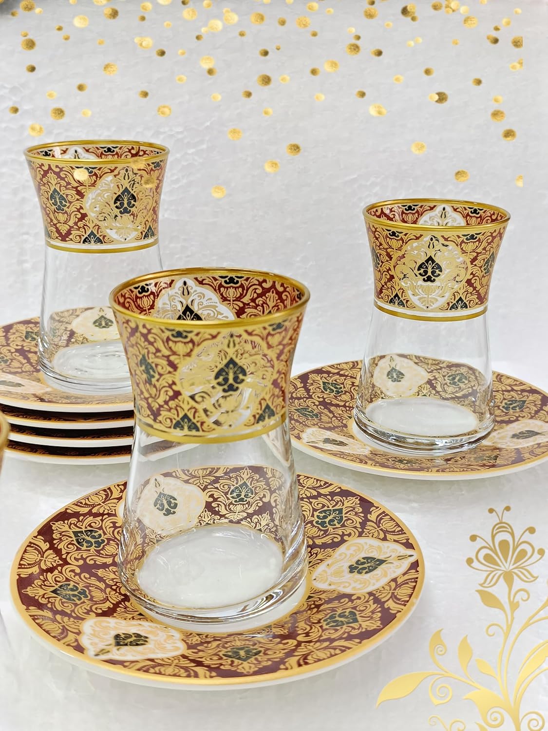 şık desenli porselen cam çay seti Heybeli Altın Bordo Desenli Cam Porselen Çay Seti 6 Kişilik Tea Set For 6 Persons Premium Porcelain