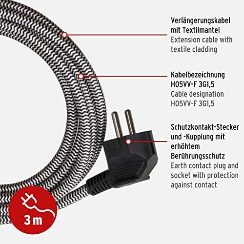 İç mekan için 3 m uzatma kablosu (3 m tekstil kablo, iç mekanda kullanım için, ışıklı açma/kapama şalterli uzatma kablosu) siyah/beyaz