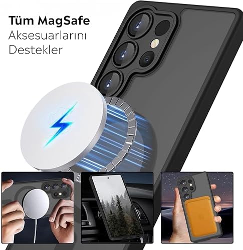 için Kılıf Kamera Korumalı Mag-safe Şarj Özellikli Mat Şeffaf Renkli Kılıf (Siyah, Galaxy S25 Ultra)