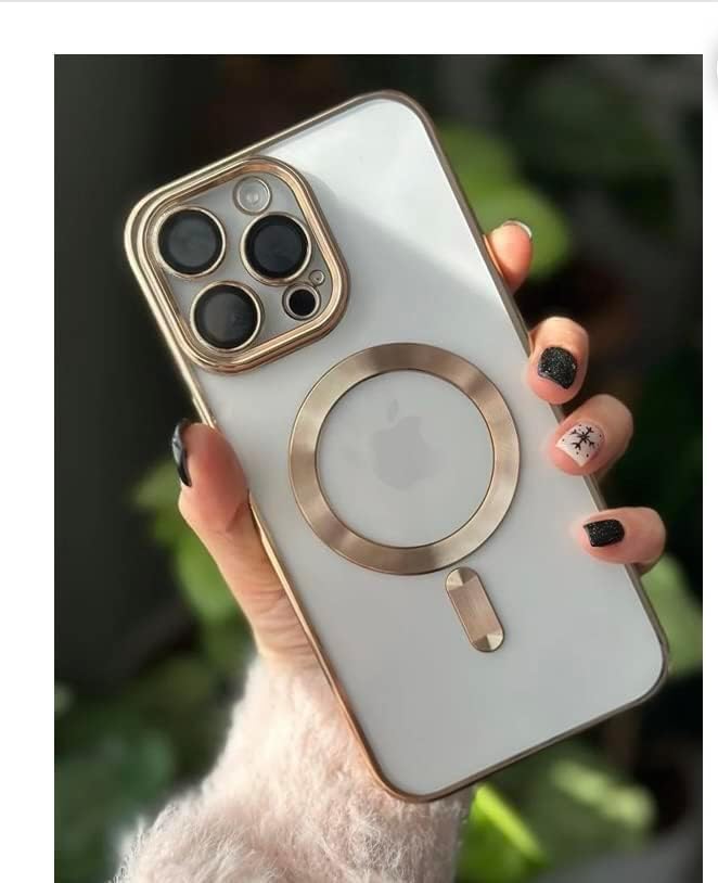 iphone 14 pro için kablosuz şarj ile uyumlu, kamera lens korumalı lazer kılıf gold