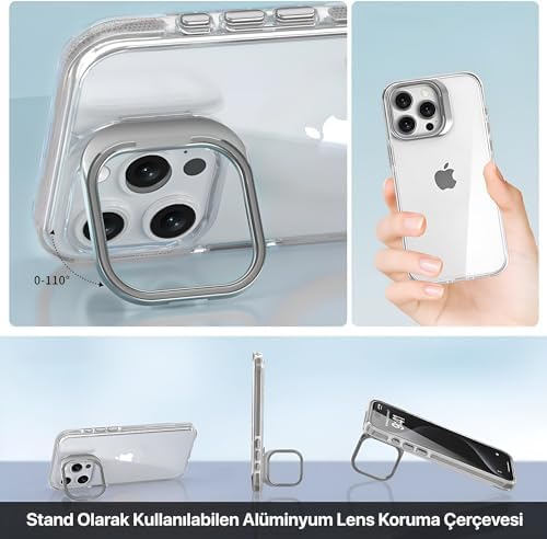 iphone 15 Pro Max için Hybrid Performance Serisi Ultra Şeffaf Sert Polikarbonat Arka Kısım Orta Sertlikte Silikon Kenarlar ve Stand Olabilen Lens Çerçeveli Kılıf (Natural Titanyum, 15 Pro Max)
