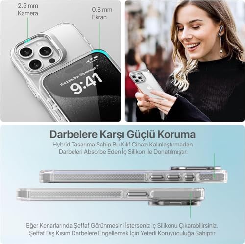 Ultra Şeffaf Polikarbonat Arka Bölüm ve Süper Şeffaf Silikon Kenarlar ile Premium Görünüm Şık Tasarımlı Alüminyum Alaşım Lens Çerçevesi ile Hem Kamera Koruma Hem de Stand Olarak Kullanılabilme Kenarların iç Kısmında Bulanan Opak Silikon Materyal Sayesinde Hem Şık Görünüm Hem de En Sert Darbelere Karşı Bile Kusursuz Koruma Yüksek Hassasiyette Çalışan Yarı Saydam Tuşlar Ve Aksiyon Butonu Cihazla Bütünleşen ve Oldukça Şık Bir Görünüm Sağlayan Kusursuz Tasarım iphone 15 Pro Max için Hybrid Performance Serisi Ultra Şeffaf Sert Polikarbonat Arka Kısım Orta Sertlikte Silikon Kenarlar ve Stand Olabilen Lens Çerçeveli Kılıf (Natural Titanyum, 15 Pro Max)