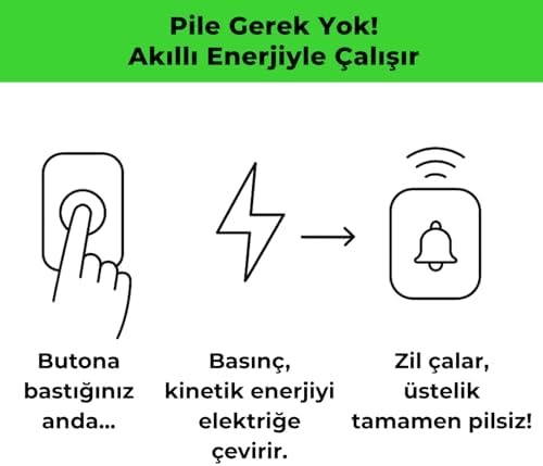 Kablosuz Kapı Zili Kiti, 150 metreye kadar bağlantı aralığını destekler. Pil gerektirmez, vericiye bastığınızda oluşan kinetik enerji ile çalışır. 0dB'den 110dB'ye kadar 5 ayarlanabilir ses seviyesi vardır. Sessiz modda sadece ışık göstergesi çalışır. Beğendiğiniz zil seslerini seçmeniz için 60 melodi vardır. Vericiye basıldığında, prize takılı olan alıcı üzerindeki mavi LED gösterge yanıp söner. Bu özellik, ileri derecede işitme bozukluğu olanlar için de yararlıdır. Alıcıyı bir elektrik prizine takın. Vericiyi ise isterseniz verilen vidaları kullanarak veya çift taraflı yapışkan yamayı kullanarak dış duvara takın, kapı ziliniz artık kullanıma hazırdır. Kablosuz Kapı Zili Seti Pil Gerektirmez, Kinetik Enerjili Kapı Zili Pilsiz Şarjsız Kablosuz Fişi Prize Tak Çalıştır, LED Işıklı, Su Geçirmez, Ev Ofis için Uygun (1 Verici + 1 Alıcı)