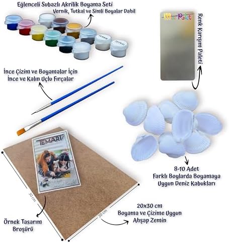 7-9 adet doğal deniz kabuğu, 12’li su bazlı akrilik boya seti 2 adet kalın ve ince uçlu resim fırçası 1 adet pratik boya paleti, 1 Adet 20×30 cm ahşap zemin Sete özgün online olarak izlenebilen eğitim videosu ve tasarım destek broşürü set bileşenleridir. Kabuk Boyama/Filamingo Tema Etkinlik Seti