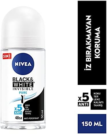 Kadın Deodorant Black&White Invisible Pure terlemeye ve ter kokusuna karşı etkilidir X5 Anti: Özel geliştirilmiş x5 anti formülü sayesinde koku, ter, leke, kalıntı ve tahrişe karşı savaşır. Açık renk giysilerde sarı leke, koyu renk giysilerde ise beyaz iz oluşumuna karşıdır. Etil alkol içermez Ciltle uyumu dermatolojik olarak kanıtlanmıştır. Ürün koltuk altına uyguladıktan sonra tamamen kurumasını bekleyin Kadın Deodorant Black & White Invisible Pure 48 Saat Anti-perspirant Koruma (50 ml)