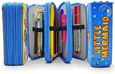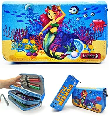 Kalem Kutusu Deniz Kızı Desenli Organizer Kalemkutu Vegan Deri Üç Bölmeli Kalemlik-Mavi