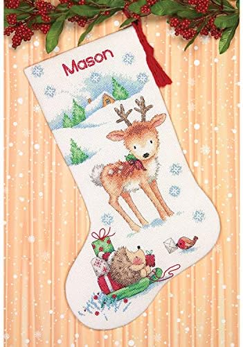 Kanaviçe “Ren Geyiği ve Kirpi” Kişiselleştirilmiş Çorap Seti, Beyaz 14 Adet Aida, 40 cm
