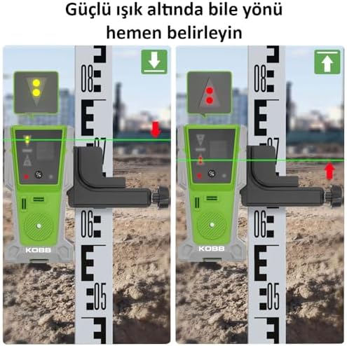 60m mesafeye kadar kobb kırmızı ve yeşil lazer hizalama modelleri ile açık havada lazer ışınlarının görünmediği alanlarda lazer hattı doğrultusunda yatay veya dikey tarama yaparak sesli ve ışıklı ikaz ile lazer merkez noktasını tespit edebilmenizi sağlar Sesli ikaz düğmesi ile istenildiği zaman sesli ikaz uyarısı devre dışı bırakarak ışıklı ikaz ile lazer tespiti yapabilme imkanı Sol ve arka köşesindeki ışıklı ikaz göstergeleri ile lazer hattının yönünü hassas olarak bulup işaretleme imkanı KBL8RG 60 Metre Lazer Hizalama Dedektörü