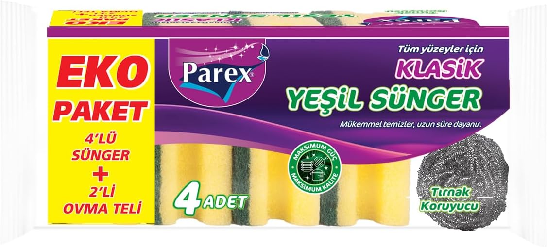 Temizleme işlemini etkin ve verimli şekilde gerçekleştirir Dayanıklı ve uzun süre kullanılabilen yapı Kolay kullanım sağlayan tasarım Klasik Yeşil Sünger Oluklu 4'lü + 2’li Ovma Teli Klasik Yeşil Sünger Oluklu 4'lü + 2’li Ovma Teli