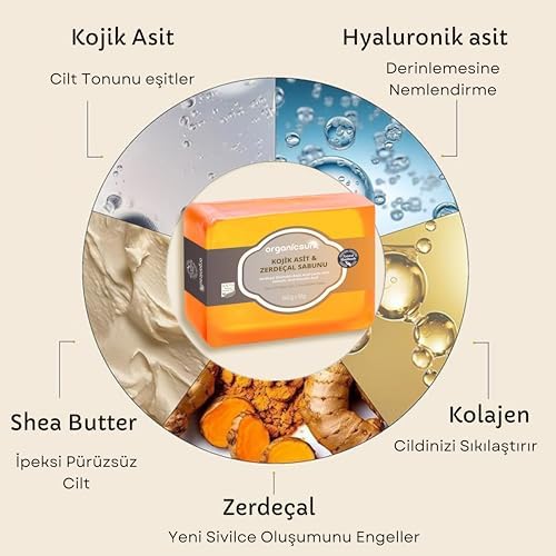 Kojik Asit & Zerdeçal Sabunu 140 Gr 1 Adet Leke ve Sivilce Karşıtı Kojic Acid – Kolajen – AHA BHA – C Vitamini – Hyaluronic Acid – Shea Butter Yağı İçerikli Aydınlatıcı Sabun