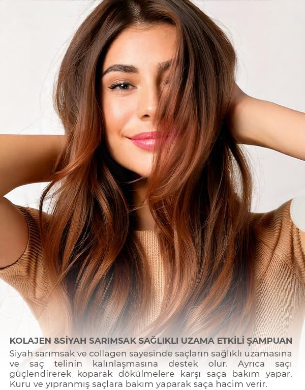 Nazik formülüyle saçlarınızı temizlerken doğal parlaklık kazandırır Kolajen ve Siyah Sarımsak Sağlıklı Uzama Etkili Şampuan 1 L