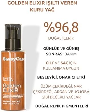 Zengin doğal yağ karışımı, ile cildinizi derinlemesine besler ve korur. Üzüm çekirdeği, Nar çekirdeği, Argan ve Jojoba gibi değerli yağlar cildi nemlendirirken, doğal renk pigmentleri bronzlaştırıcı ışıltı sağlar. İçeriğindeki Biberiye yağı antioksidan özellikleriyle ciltte canlandırıcı etki yaratır. Hafif formülü ile ciltte yağlı his bırakmadan hızlıca emilir. Güneş sonrası bakım ve günlük cilt ışıltısı için idealdir. Kuru Yağ Golden Elixir Cilt, Saç ve Vücut İçin Işıltı Veren Besleyici Bakım Yağı 100 ml