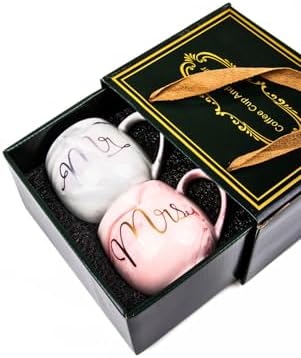 Lüks Mermer Desenli Mr & Mrs 2'Li Porselen Kupa Seti – 400 Ml, Hediyelik Kutulu,Pembe & Gri