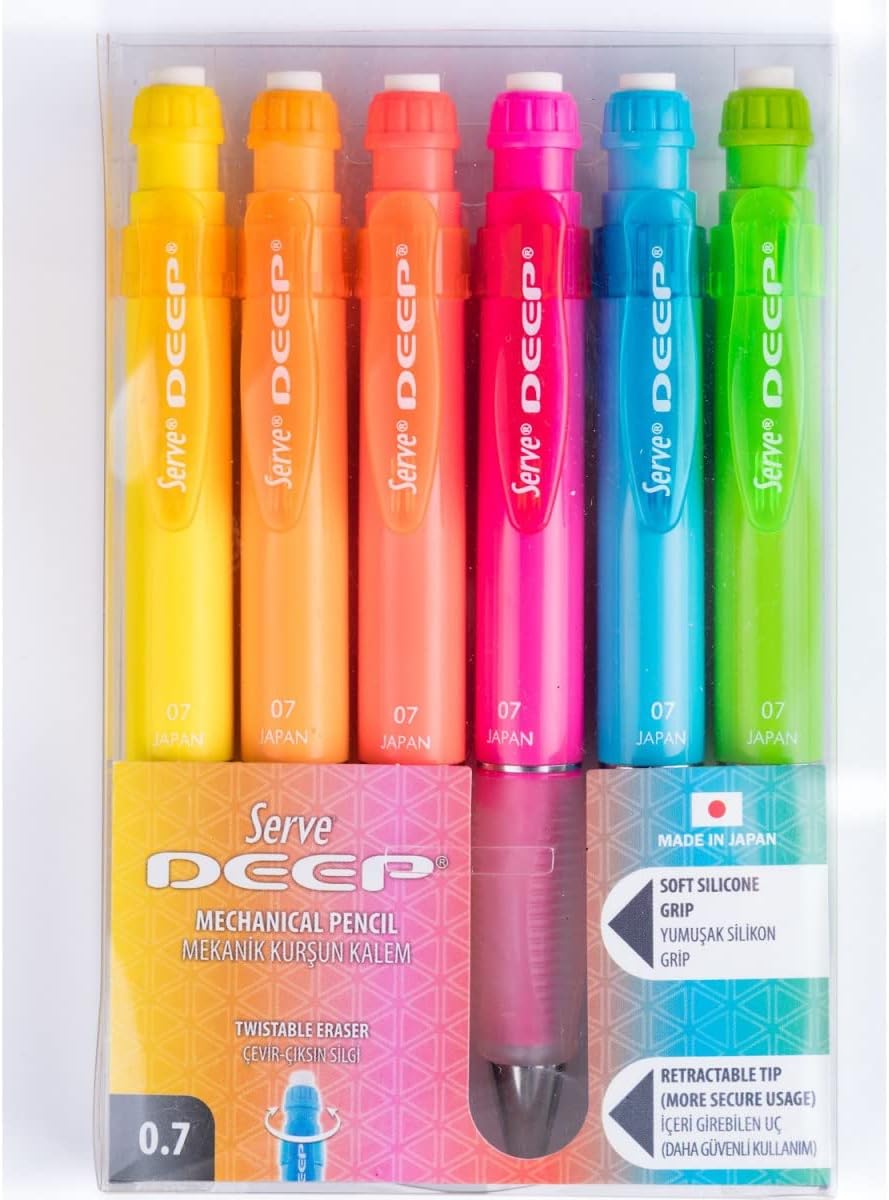 Dayanıklı malzeme Çevirince ortaya silgi çıkar Gizlenebilir Uç Mekanizması ile güvenli kullanım Ergonomik grip M.Kursun Kalem Fosforlu 6 Li Pet