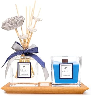 Masif Ahşap Tepsili Vıp Yasemin Sandal Oda Kokusu ve Mum Seti