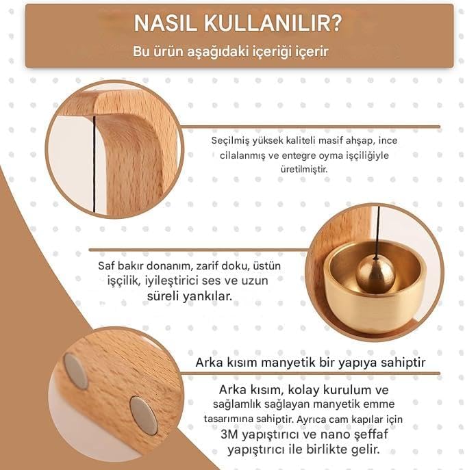 Doğal malzeme, premium his: Seçilmiş masif ahşap gövde ve pirinç çan haznesi ile sıcak, minimal ve şık bir görünüm sunar. Net ve uzun süreli çınlama: Pirinç çan yapısı ve dengeli sarkaç topu sayesinde tek dokunuşta berrak, uzun yankılı bir ses verir. Manyetik arka yüzey: Metal yüzeylere delmeden, iz bırakmadan pratik şekilde tutunur; kapı, kasa, metal çerçeve vb. yüzeylerde hızlı kullanım. Cam kapı / düz yüzey için yapıştırmalı kurulum: Kutudan 3M bant + şeffaf nano yapıştırıcı çıkar; cam ve düz yüzeylerde kolay montaj sağlar. Kompakt ölçü: Yaklaşık 7 cm yükseklik; küçük alanlarda bile zarif durur. Ev, ofis, dükkân girişleri ve oda kapıları için ideal. Masif Ahşap ve Pirinç Kapı Zili Rüzgar Çanı (Manyetik) | Yapıştırıcılı/Cam Kapı Uyumlu | Minimal Dekoratif Kapı Çanı | Ev Ofis Dükkan Giriş Zili