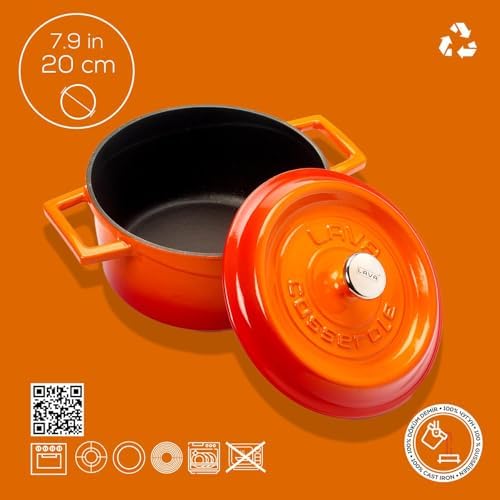 Tencere Yuvarlak 20 cm Döküm Demir Yekpare Kulplu 3 Kat, 2 Fırın Döküm Demir Trendy Kapak Metal Tepe Metal Döküm Yuvarlak Tencere, 20 cm, Turuncu