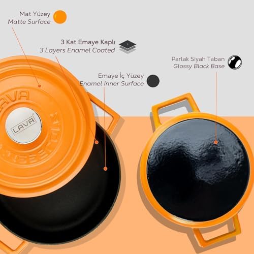 Çok Amaçlı Tencere Yuvarlak 24 cm Döküm Demir Yekpare Kulplu Mat, Parlak Siyah Taban 3 Kat, 3 Fırın Döküm Demir Trendy Kapak Metal Tepe Metal Spring Serisi – Döküm Çok Amaçlı Tencere, Yuvarlak, 24 cm, Mat, Parlak Siyah Taban, Turuncu
