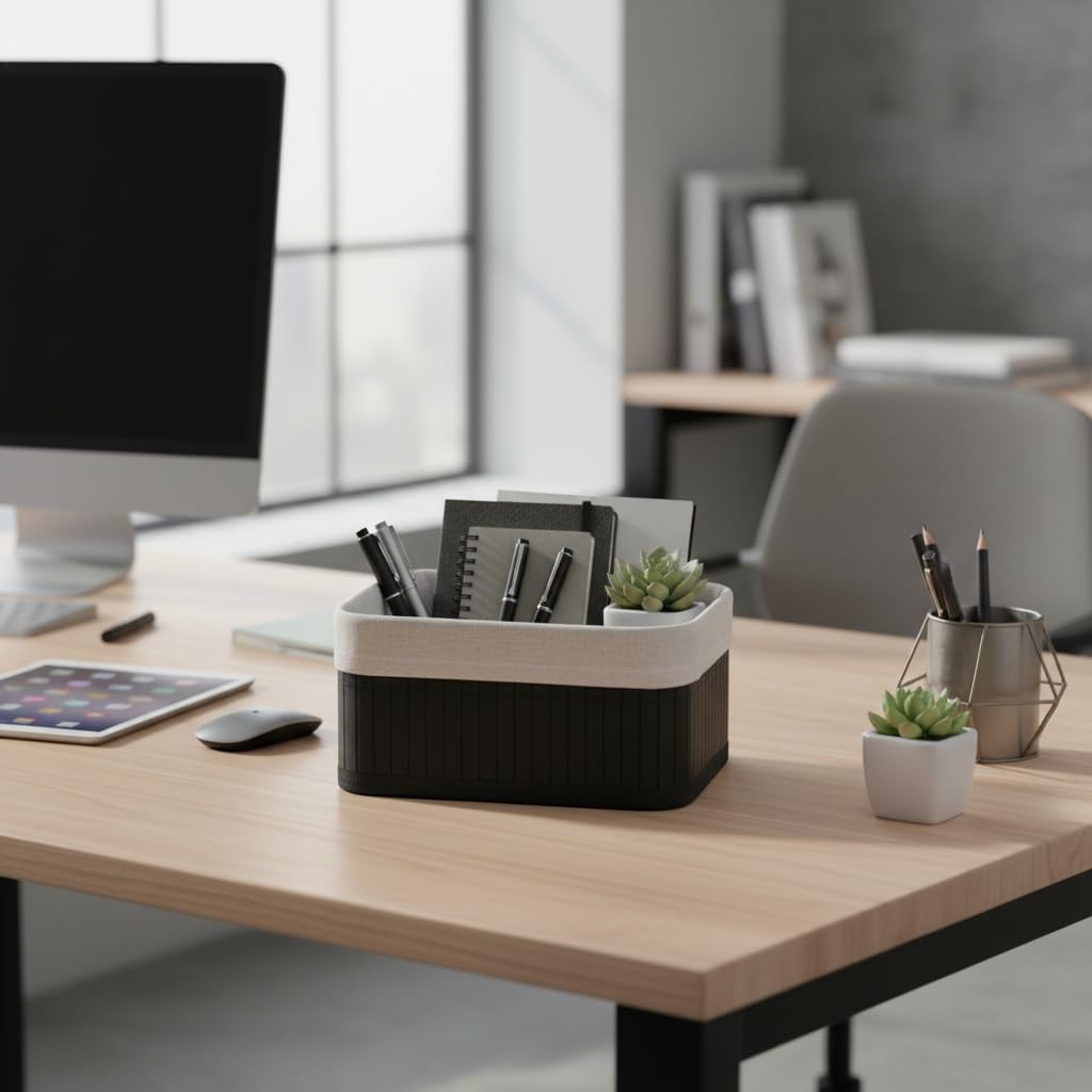 Mini Dikdörtgen Bambu Düzenleyici ve Saklama Sepeti – Siyah Ahşap Banyo, Makyaj ve Ofis Organizeri, Kumaş Astarlı Çok Amaçlı Dekoratif Kutu (20x15x10 cm)