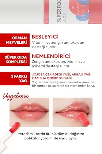 Arı sütü ve propolis içeriği Jojoba ve argan yağı desteği Vitamin ve mineral kompleksi İki farklı koku seçeneği Koruyucu bariyer etkisi MISSHA Dudakları Nemlendiren ve Besleyen Orman Meyveli Dudak Bakım Yağı Super Food Lip Oil Berry