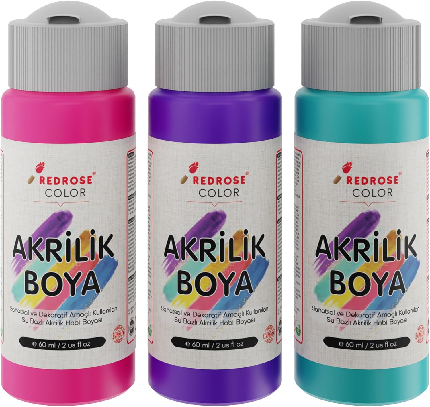 Dayanıklı yapısıyla uzun süre kullanılabilir Mor, Fuşya, Turkuaz Akrilik Boya 3'lü Set 3×60 ml