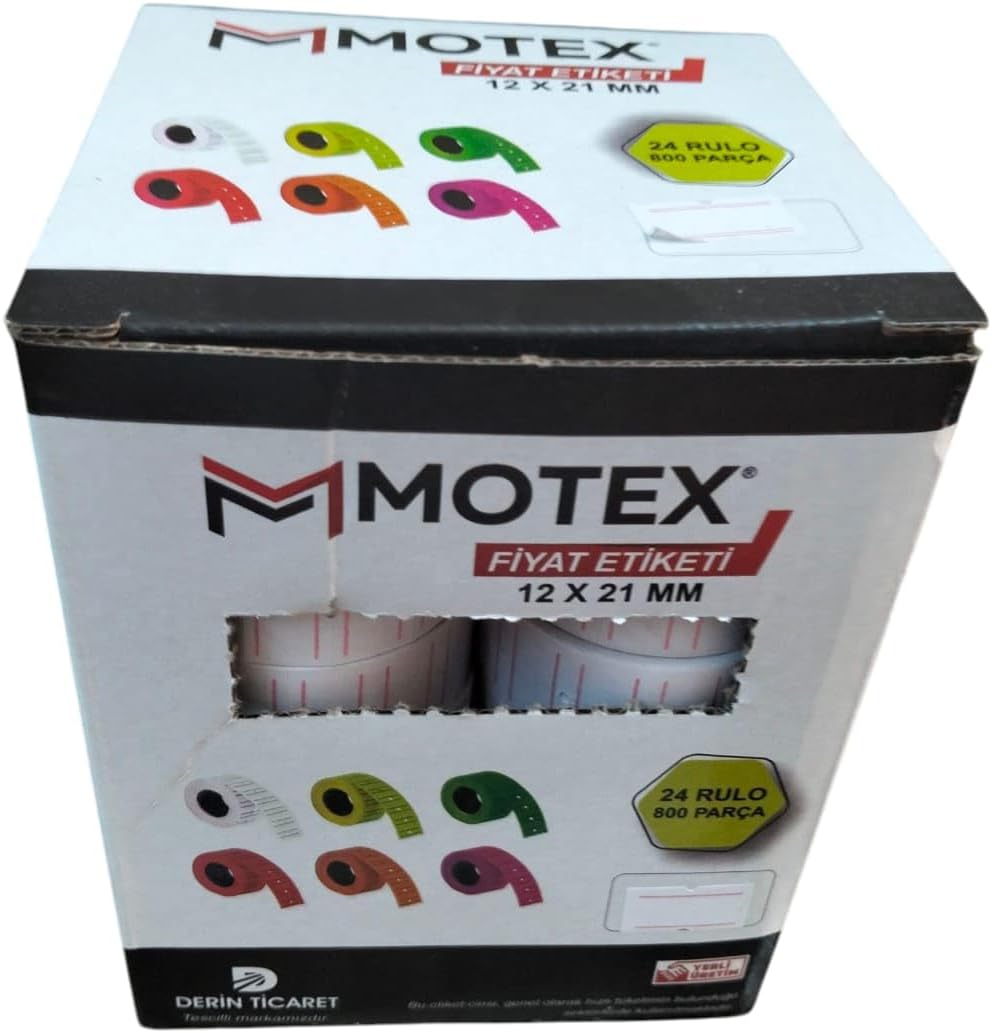 Mx-5500 Fiyat Etiketi 12×21 mm 24 Adet Rulo 800×24 Rulo 1 Pakette 24 Rulo, 1 Rulo da 800 adet etiket bulunur. Toplamda 19200 Adet etiketleme yapılır. 12 mm x 21 mm ebatları motex 5500 ile tam uyumlu Sökülünce iz bırakmaz Kumaş ve düz yüzeylerde kullanılabilir. Mx-5500 Fiyat Etiketi 12×21 mm 24 Adet Rulo 800×24 Rulo Beyaz