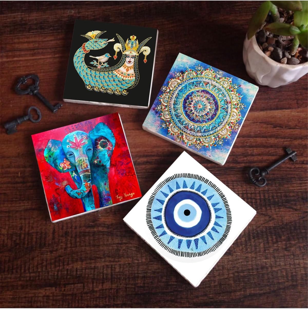 Nazar, Mandala, Fil, Şahmeran Taş Bardak Altlığı Seti – 4 Parça – Dekoratif, Rustik Mutfak Aksesuarı, 10×10 cm, Kaydırmaz Tabanlı, Şık ve Dayanıklı SC124