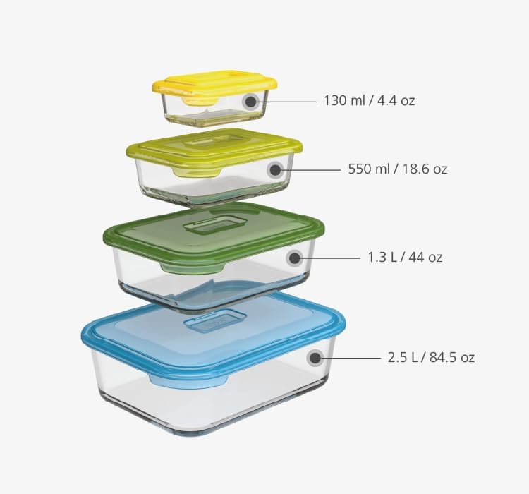 Kompakt, yerden tasarruf sağlayan tasarım Kolayca çekilebilen tırnaklarla kolay bulunabilen, geçmeli kapaklar Sert, borosilikat cam kaplar Buzlukta ve mikrodalgada kullanılabilir. Bulaşık makinesinin üst rafında yıkanabilir Nest Glass Storage – 4 parçalı cam saklama kabı seti – çok renkli kapaklar