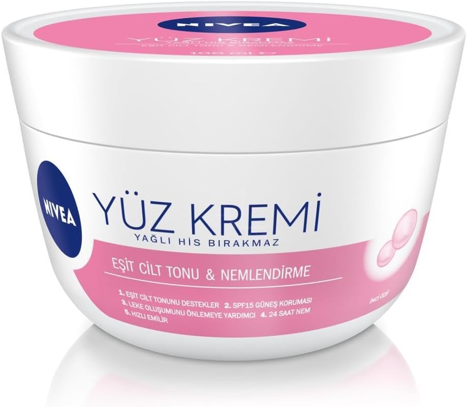 110 yıllık cilt bakım uzmanı NIVEA'dan İnci özü içeren formülü ile yağlı his bırakmadan cildi nemlendirir ve eşit cilt tonunu destekler 24 saat nemlendirir Yağlı his bırakmaz Hızlı emilir NIVEA Cilt Tonu Eşitleyici Yüz Kremi 100 ml, Eşit Cilt Tonu, 24 Saat Nemlendirici Yüz Kremi, SPF15 ile Güneş Koruyucu, Hızlı Emilir, Cilt Leke Oluşumunu Önlemeye Yardımcı, Hassas Ciltler için