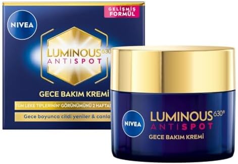 NIVEA Luminous 630 Leke Karşıtı Gece Bakım Kremi devrimsel yeniliğe sahip formülü ile 4 haftada gözle görülür sonuç sağlar Yüzünüze, boynunuza ve dekolte bölgenize Luminous 630 Leke Karşıtı Gece Bakım Kremi'ni uygulayın Hyaluronik Asit içeren formülü ile cildin canlanmasına ve güçlenmesine yardımcı olur Koyu Cilt Leke Görünümü: Luminous 630 koyu lekelerin görünümünü gözle görülür bir şekilde azaltmaya yardımcı olur Her sabah taze ve canlanmış görünen & günden güne daha eşit cilt tonuna sahip ve ışıltılı bir cilt NIVEA Luminous630 Leke Karşıtı Gece Bakım Kremi 50ml,Hyaluronik Asit, Tüm Cilt Tipleri