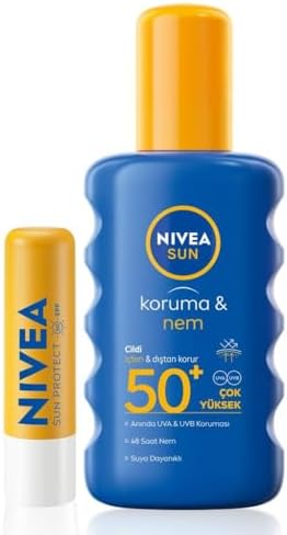 cilt tipi: Kuru NIVEA SUN Koruma ve Nem Vücut Spreyi 200ml ve Yüksek Güneş Korumalı Dudak Bakım Kremi, SPF50, Çanta Hediye