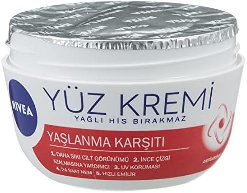 NIVEA Yaşlanma karşıtı Yüz kremi antioksidan içerikleri ile cildinizde yağlı his bırakmadan ince çizgilerin azalmasına yardımcı olur Daha sıkı cilt görünümü sağlar.İnce çizgi azalmasına yardımcı olur UV koruması sağlar Hızlı emilen formül 24 Saat boyunca cildi nemlendirir Makyaj Bazı: Cildi makyaj için hazırlarken aynı zamanda yumuşacık cilt hissi sağlar NIVEA Yaşlanma Karşıtı Yüz Kremi 100 ml, 24 Saat Nemlendirici Yüz Kremi, UV Koruması