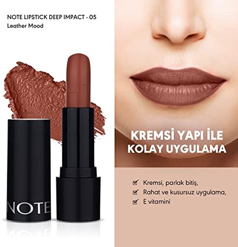 Yarı parlak bitiş Yumuşak ve ipeksi doku Yoğun renk verme özelliği Paraben içermez Dermatolojik olarak test edilmiştir Note Deep Impact Lipstick 05 Leather Mood Kremsi Dokulu Yarı Parlak Ruj, Kahverengi