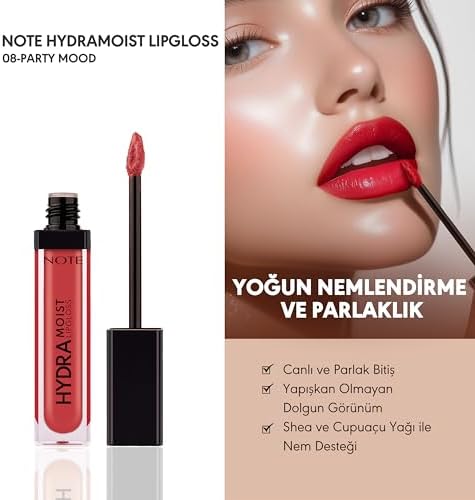 Parlak bitiş Yüksek pigment Kolay uygulama Yumuşak ve hafif doku Paraben içermez Note Hydramoist Lipgloss 08 Party Mood Nemlendirici Dudak Parlatıcısı, Kırmızı Note Hydramoist Lipgloss 08 Party Mood Nemlendirici Dudak Parlatıcısı, Kırmızı