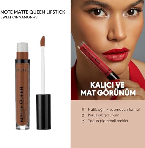 Mat bitiş Uzun süre kalıcılık Yüksek pigmentli renkler Paraben içermez Dermatolojik olarak test edilmiştir Note Matte Queen Lipstick 23 Sweet Cinnamon Kalıcı Likit Ruj, Kahverengi