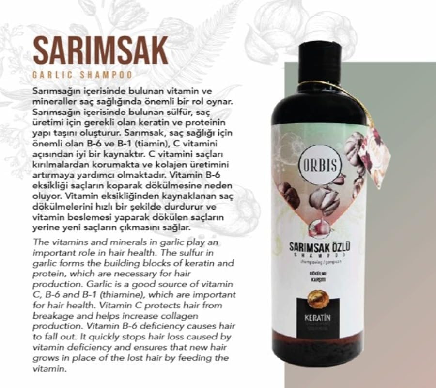 Sarımsağın içerisinde bulunan ve mineraller saç sağlığında önemli rol oynar. Sarımsağın içinde bulunansülfür, saçüretimi için gerekli olan keratin ve proteinin yapı taşını oluşturur. Sarımsak Saç sağlığı için önemli olan B-6, B-1 (tiamin) veC vitamini açısından iyi bir kaynaktır. C vitamini saçları kırılmalara karşı korur ve kolajen üretiminin artırılmasına yardımcı olmaktadır. Vitamin B-6 eksikliği saçların koparak dökülmesine neden olur, dolayısı ile vitamin eksikliğinden kaynaklı saç dökülmelerinin önüne geçer. ORBİS Sarımsak Özlü Dökülme Karşıtı Şampuan 700 ml