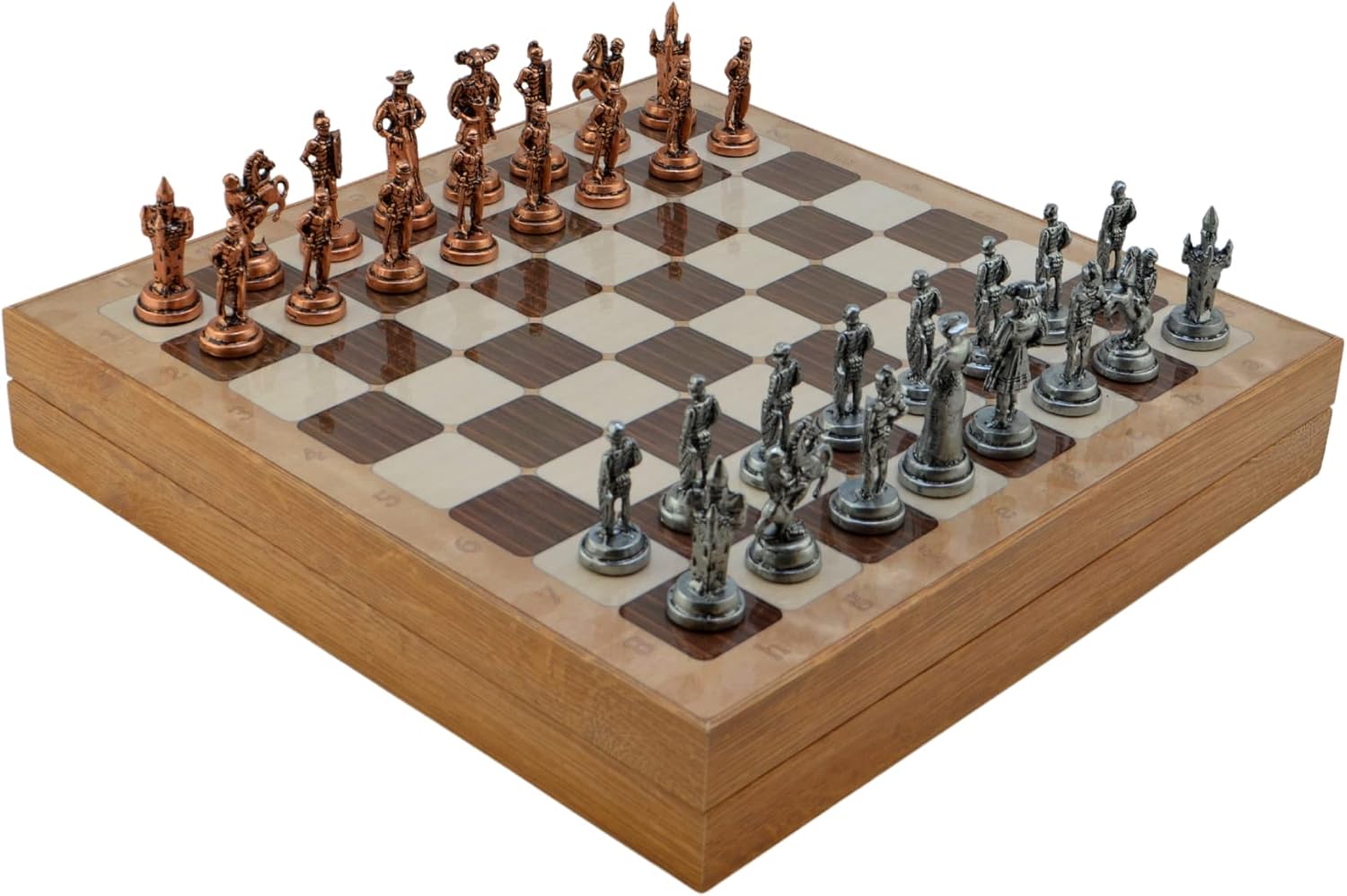 Orta Boy Metal İspanyol Satranç Takımı Antik ve Rustik Desenli Sandıklı MDF Tahtası (36x36x6 cm.)