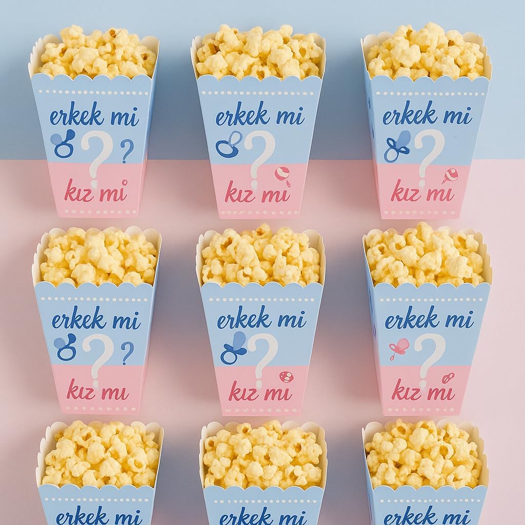 Partinity Kız mı Erkek mi Popcorn Kutusu, 8'li Set, Baby Shower ve Cinsiyet Partisi için Mısır Kutuları, Mavi-Pembe