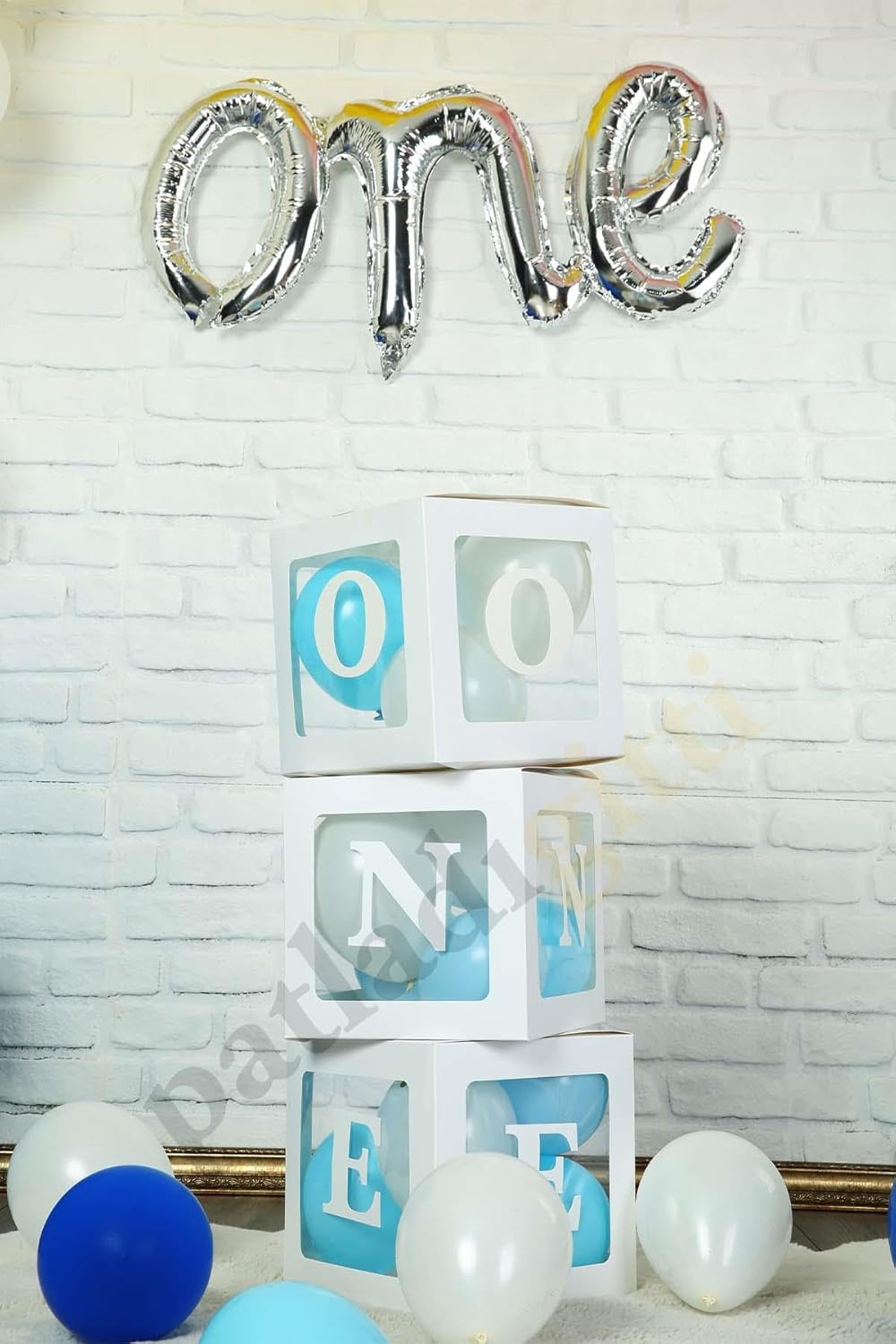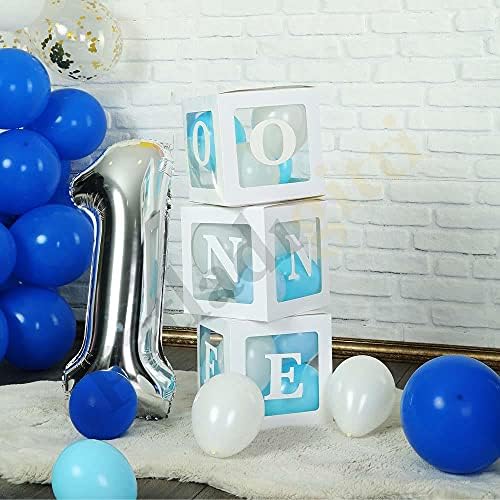 3 Adet ONE yazılı kutu Patladı Gitti One Yazılı Kutu ve Balon Seti – 1 Yaş Doğum Günü Kutlama (Beyaz (Mavi-Beyaz Balon))