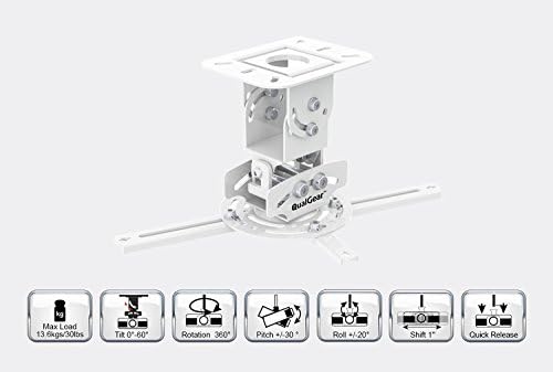 Ağır ölçü, soğuk rulo çelik malzeme, dayanıklı yapı Evrensel tasarım çoğu projektör markasına uyar; Ağırlık kapasitesi: 30 lbs. ; Projektörde desteklenen montaj delikleri aralığı: 6,6 inç – 16 inç Düşük profilli akış montajı; projektörü tavandan 6 inç'te tutar Çoklu ayarlar. Eğim: 0 ila 60 derece. Dönme: 360 derece. Rulo: +/-20 derece. Eğim: +/-30 derece. Shift: 1″ Hızlı kurulum / çıkarma için geçmeli / geçmeli tasarım PRB-717-WHT evrensel tavan tutucu aksesuarı