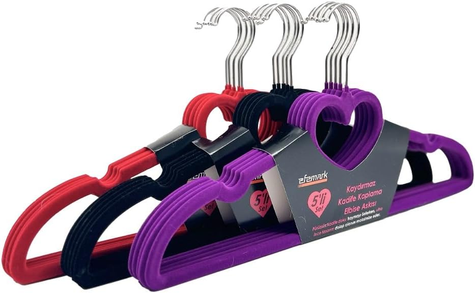Premium Serisi 20'li Ekonomik Paket Kadife Kaydırmaz Elbise Kıyafet Askısı, 10 Siyah + 5 Mor + 5 Kırmızı