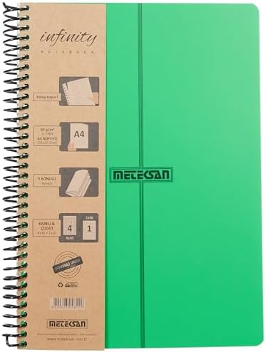 350 mikron PP (plastik) kapak 60 gr 1. hamur kağıt Pet spiralli 150 yaprak, 300 sayfa, 5 konulu (4 kareli, 1 çizgili) Türkiye'de üretilmiştir Primary Serisi, A4, 5 Konulu (4 Kareli, 1 Çizgili) 150 Yaprak PP Kapaklı Spiralli Defter, Yeşil